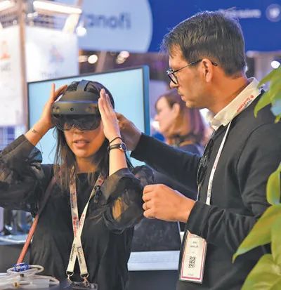 2022年6月,法国科技创新展览会上,观众在体验虚拟现实技术产品。(《人民日报》刘玲玲摄)