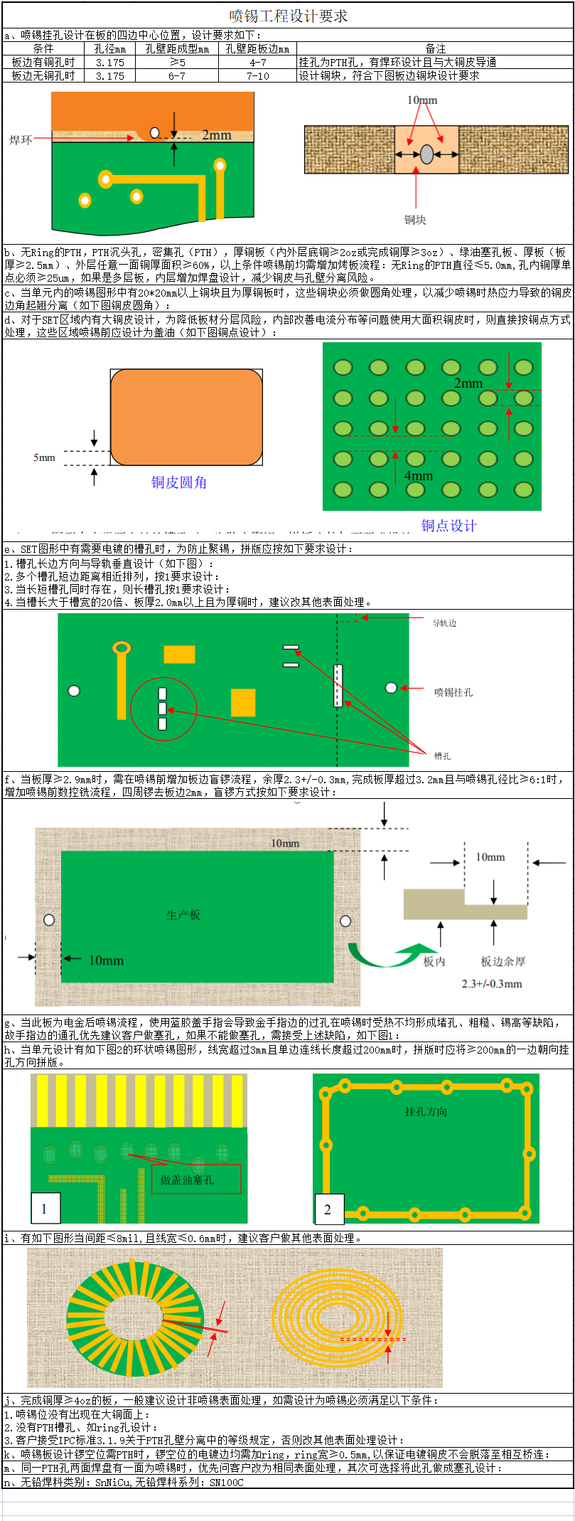 当板厚>2.0mm,孔径>1.0mm,孔距较小的情况下,金属化槽壁及孔壁的铜受热容易剥离,多层板在内层增加连接环,宽度≥8mil可解决此问题,双面板当设计满足可能出现孔铜剥离的情况下建议不做喷锡。